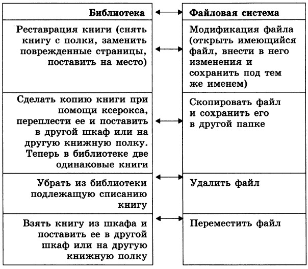 Папку открывают двойным щелчком на ее значке. Двойным щелчком на значке файла открывают соответствующий файл. Во время работы на компьютере чаще всего проводятся такие операции с файлами, как модификация, копирование, удаление и перемещение. Здесь также можно провести аналогию с книгами в библиотеке: