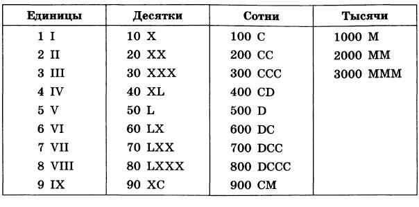 Глава 4. Материал для любознательных Римская система счисленияПримером непозиционной системы счисления, которая сохранилась до наших дней, может служить система счисления, применявшаяся более двух с половиной тысяч лет назад в Древнем Риме. В основе римской системы счисления лежат знаки I (один палец) для числа 1, V (раскрытая ладонь) для числа 5, X (две сложенные ладони) для 10, а также специальные знаки для обозначения чисел 50, 100, 500 и 1000.