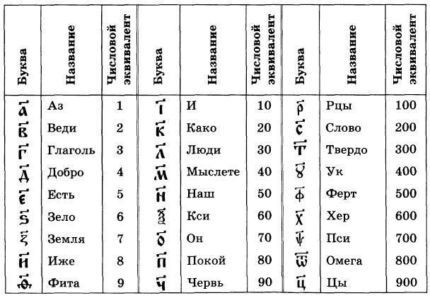 Глава 4. Материал для любознательных Славянский цифровой алфавитАлфавитной нумерацией пользовались также южные и восточные славянские народы. У одних славянских народов числовые значения букв установились в порядке славянского алфавита, у других же (в том числе у русских) роль цифр играли не все буквы славянского алфавита, а только те из них, которые имелись и в греческом алфавите. Над буквой, обозначавшей цифру, ставился специальный значок *-• («титло»). При этом числовые значения букв возрастали в том же порядке, в каком следовали буквы в греческом алфавите (порядок букв славянского алфавита был несколько иным). Например, если записать в славянской нумерации числа 55, 288, 1 и 498, то получится фраза: В России славянская нумерация сохранялась до конца XVII века. При Петре I возобладала так называемая арабская нумерация, которой мы пользуемся и сейчас. Славянская нумерация сохранилась только в богослужебных книгах. Ниже приведен славянский цифровой алфавит: