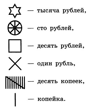 Дабы не можно было сделать здесь никаких прибавлений, все таковые знаки очерчивать кругом прямыми линиями». Например, 1232 рубля 24 копейки изображались так: