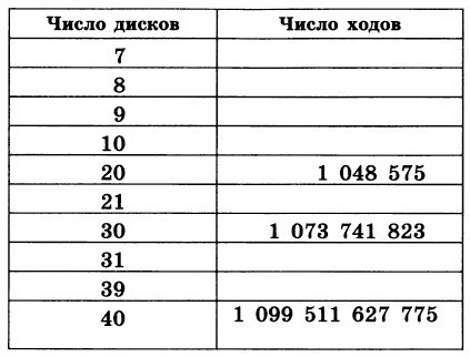 2. Назовите числа: 1 048 575, 1 073 741 823, 1 099 511 627 775. Что это за числа? 3. Для того чтобы переместить башню из 64 дисков, при безошибочной работе потребуется 18 446 744 073 709 551 615 перекладываний. Сколько уйдет на это времени, если считать, что на одно перекладывание уходит одна секунда? Для выполнения вычислений используйте приложение Калькулятор. 4. Переместите башню из пяти дисков, действуя по следующим правилам: на первом, третьем и других нечетных шагах переносите самый маленький диск «по кругу» (1-2, 2-3, 3-1); на четных шагах переносите диск между теми стержнями, где нет самого маленького кольца. Что вы можете сказать об этом алгоритме?