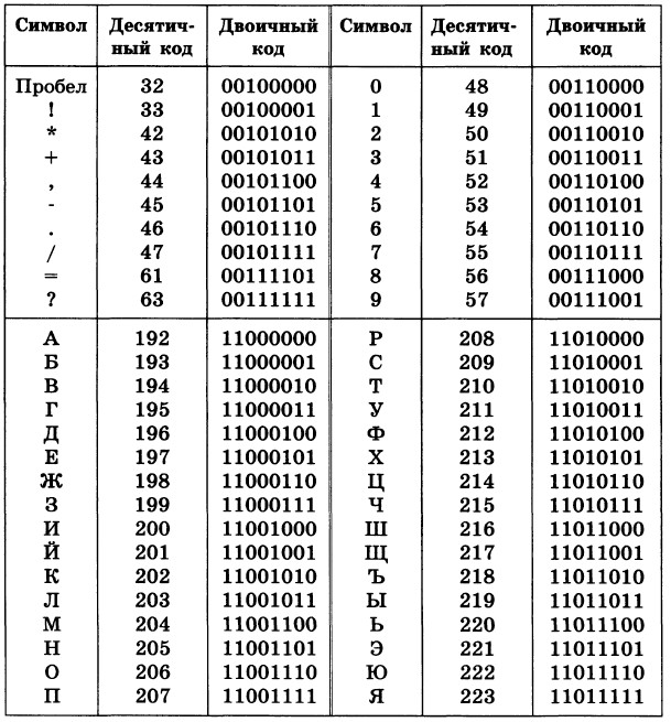 § 1.3. Как информация представляется в компьютере, или Цифровые данные Тексты в памяти компьютераПри двоичном кодировании текстовой информации чаще всего каждому символу ставится в соответствие уникальная цепочка из 8 нулей и единиц, называемая байтом. Всего существует 256 разных цепочек из 8 нулей и единиц. Это позволяет закодировать 256 разных символов. Например, прописные и строчные буквы русского и латинского алфавитов, цифры, знаки препинания, другие символы. Соответствие символов и кодов задается с помощью специальной кодовой таблицы. Ниже приведен фрагмент таблицы, используемой в системе Windows: