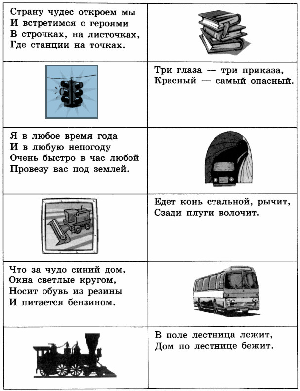 Глава 5. Компьютерный практикум Работа 7. Размещаем текст и графику в таблице1. Откройте текстовый процессор MS Word. 2. Откройте текстовый файл Загадки.doc (Мои документы\6класс\Заготовки). 3. Под текстом создайте таблицу, состоящую из 2 столбцов и 6 строк. 4. Загадки разместите в ячейках таблицы «лесенкой». Переносите нужные фрагменты текста следующим способом: 1) выделите нужный фрагмент; 2) нажмите левую кнопку мыши внутри выделенной области и перетащите фрагмент в нужное место; 3) отпустите кнопку мыши. 5. В ячейку таблицы, рядом с первой загадкой, поместите картинку-разгадку из коллекции ClipArt. Для этого: 1) поместите указатель мыши в нужную ячейку и выполните команду [Вставка-Рисунок-Картинки]; 2) в поле ввода Искать (Найти клипы) введите ключевое слово книги. Для запуска поиска щелкните на кнопке Начать (нажмите клавишу Enter); 3) выберите щелчком подходящий рисунок (щелкните на появившейся кнопке Вставить клип). 6. Щелкните левой кнопкой мыши внутри области рисунка — вокруг рисунка появится восемь черных прямоугольников — маркеров. Перетаскивая маркеры, придайте рисунку размеры по вашему усмотрению. 7. Повторите п. 5-6 для оставшихся загадок (соответствующие рисунки находятся по ключевым словам Транспортные средства). 8. В верхней части страницы создайте красочную надпись «ЗАГАДКИ». Получившийся документ должен иметь примерно такой вид: Загадки