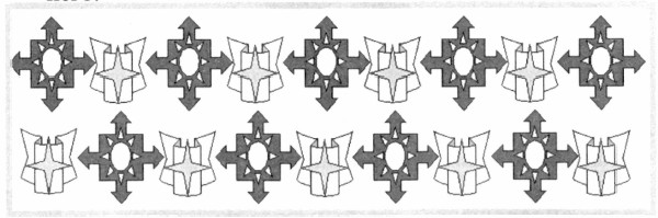 1 Орнамент — узор, состоящий из ритмически упорядоченных одинаковых элементов; предназначается для украшения различных предметов, архитектурных сооружений, произведений декоративно-прикладного искусства и т. п. 3. Для создания орнамента продумайте, соберите и раскрасьте повторяющийся фрагмент, например, такой: Чтобы закрасить автофигуру, ее следует выделить (щелчок левой кнопкой мыши) и указать цвет заливки. 4. Сгруппируйте созданный фрагмент. 5. В случае необходимости уменьшите созданный вами фрагмент так, чтобы его можно было 3-4 раза разместить по ширине страницы. 6. Скопируйте фрагмент в буфер и вставьте нужное количество его копий так, чтобы получилось 2-3 ряда по 3-4 фрагмента в каждом ряду. 7. С помощью инструмента Прямоугольник изобразите большой прямоугольник (Нет заливки, Тип линии — 6 пт), так чтобы орнамент оказался внутри него: