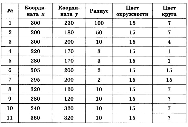 Глава 5. Компьютерный практикум. Работа 21 Исполнитель CIRCLE3. Для обработки каждой строки таблицы вам потребуются две команды. Например, команда CIRCLE (100,150), 50, 15 предназначена для изображения окружности белого цвета с центром в точке (100,150) и радиусом 50. Команда PAINT (100,150), 7, 15 предназначена для окрашивания внутренней области данной окружности в цвет с номером 7; здесь (100,150) — точка, лежащая внутри окружности, 7 — цвет заливки внутренней области окружности (круга), 15 — цвет самой окружности (границы области). 4. Самостоятельно наберите команды, соответствующие строкам 2-11 таблицы. 5. Отладьте набранную вами программу. 6. Сохраните свою программу под именем Чебураш. 7. Завершите работу со средой программирования QBasic. Задание 3 Задача: написать программу на основании информации, представленной в таблице.