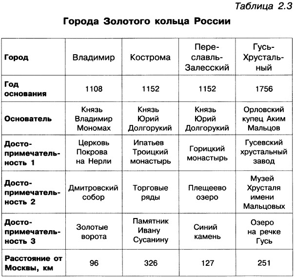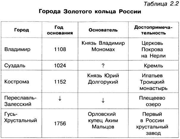 В этой таблице приведена информация о некоторых древних русских городах, хранящих уникальные памятники нашей культуры и истории и образующих всемирно известное Золотое кольцо России. Эта информация отражена в заголовке таблицы.