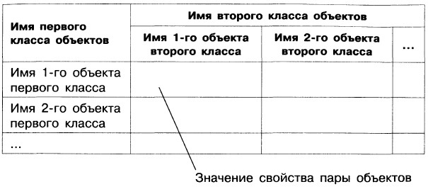 В таблице типа ООО фиксируется одно свойство пары объектов, поэтому в ее ячейках всегда содержатся значения одного типа: или числа, или слова, или графические изображения.