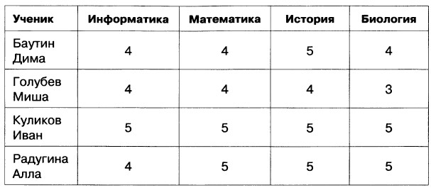 Глава 2. Информационное моделирование § 2.9. Графики и диаграммыВизуализация многорядных данныхПредположим, классный руководитель предложил вам подготовить к родительскому собранию диаграмму об успеваемости на основании информации, представленной в следующей таблице: