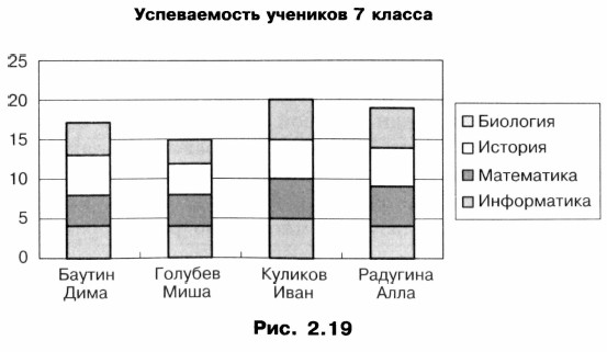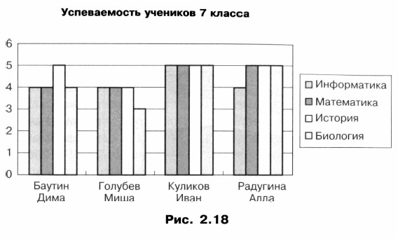 В отличие от предыдущих случаев, здесь мы имеем дело с многорядными данными: 1-й ряд — оценки Баутина Димы, 2-й ряд — оценки Голубева Миши, 3-й ряд — оценки Куликова Ивана, 4-й ряд — оценки Радугиной Аллы. Здесь нам придется несколько величин сравнить несколько раз (в нескольких точках). В этом случае круговую диаграмму нельзя использовать в принципе. Можно построить столбчатую диаграмму, представив на ней данные сразу обо всех учениках — рис. 2.18.