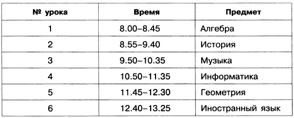 4. В таблице приведено расписание уроков на один учебный день для учеников 7 класса.