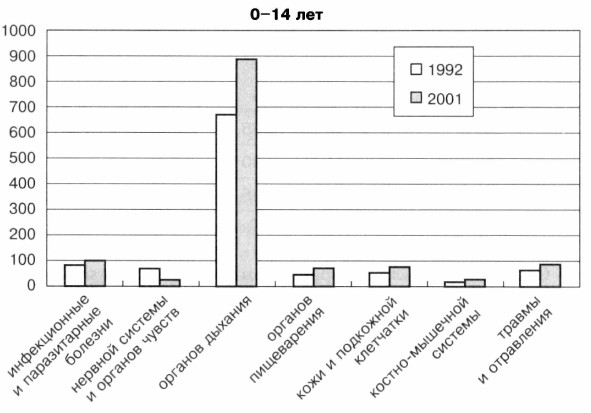 6. Данные Министерства здравоохранения Российской Федерации об изменениях за десять лет (1992-2001 годы) в структуре заболеваемости детей в возрасте до 14 лет представлены столбчатой диаграммой: