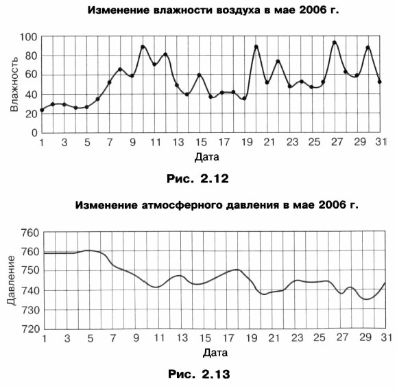 Аналогичную информацию обеспечивают графики изменения влажности воздуха и атмосферного давления, построенные на основании 3-й и 4-й граф таблицы (рис. 2.12, 2.13).