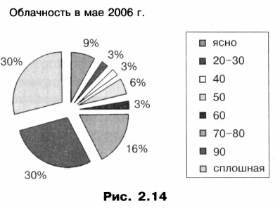 На диаграмме (рис. 2.14) не указано количество дней с определенной облачностью, но показано, сколько процентов от общего числа дней приходится на дни с той или иной облачностью.