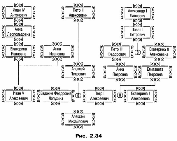 Родственные связи между членами семьи удобно изображать с помощью схемы, называемой генеалогическим или родословным деревом. На рисунке 2.34 показана родословная Романовых. Здесь корень дерева находится снизу. Изображать дерево отношений можно в любом направлении — это дело вкуса разработчика модели.
