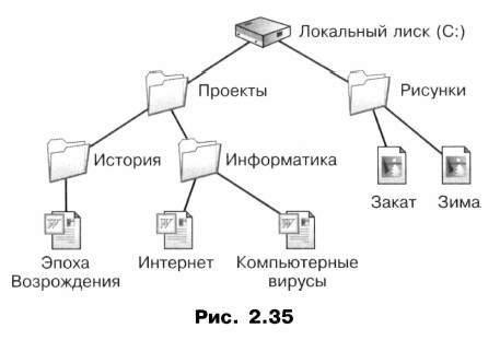 Вы знаете, что по определенному признаку (принадлежность, назначение, содержимое, время создания и т. д.) файлы целесообразно объединять в папки. Папки, в свою очередь, могут вкладываться в другие папки и т. д. (рис. 2.35). Главная (корневая) вершина этой иерархии соответствует определенному устройству внешней памяти: