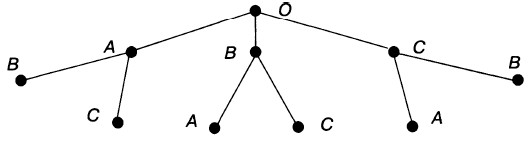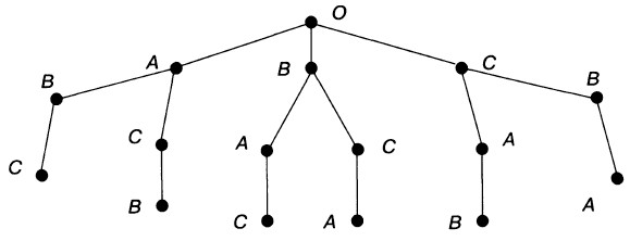Использование графов при решении задачГрафы удобно использовать при решении некоторых классов задач. Задача 1 Сколькими способами можно рассадить в ряд на три стула трех учеников? Выписать все возможные случаи. Решение этой задачи удобнее всего представить в виде дерева. За его корневую вершину возьмем произвольную точку плоскости О. На первый стул можно посадить любого из трех учеников — обозначим их А, В и С. На схеме это соответствует трем ветвям, исходящим из точки О: