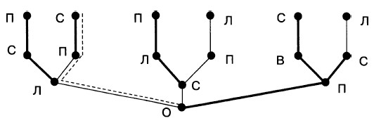 Цролетавший мимо голубь шепнул Ивану-царевичу, что только один совет ворона верный и что обязательно надо пройти по тропинкам разных направлений. Наш герой выполнил задание и попал в волшебный сад. Каким маршрутом он воспользовался? Обозначим левую, среднюю и правую тропинки соответственно Л, С и П. Возможные маршруты представим в виде графа. При этом подсказки ворона отметим более «жирными» ребрами. Так как только один совет ворона верен, то на графе ему будет соответствовать маршрут, имеющий одно «жирное» ребро. Этот маршрут обозначен дополнительной пунктирной линией: