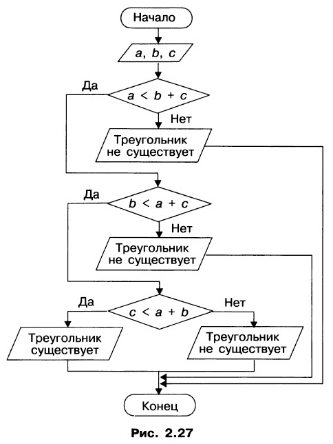 Последовательность действий указывается с помощью стрелок, соединяющих фигуры, обозначающие шаги алгоритма. Например, проверку существования треугольника с заданными длинами сторон а, b и с с помощью блок-схемы можно изобразить, как показано на рис. 2.27.