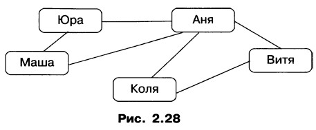 Информационные модели на графахНаглядным средством представления состава и структуры системы является граф. Граф состоит из вершин, связанных линиями. Если линия направленная (со стрелкой), то она называется дугой; линия ненаправленная (без стрелки) называется ребром. Линия, выходящая из некоторой вершины и входящая в нее же, называется петлей. Вершины могут изображаться кругами, овалами, точками, прямоугольниками и т. д. Если объекты некоторой системы изобразить вершинами, а связи между ними — линиями, то мы получим информационную модель рассматриваемой системы в форме графа. СетиРанее мы рассматривали графы — схемы отношений, отражающие имеющиеся связи между объектами. Например, граф, отражающий отношение «переписываются» между объектами класса «дети», может выглядеть, как показано на рис. 2.28.
