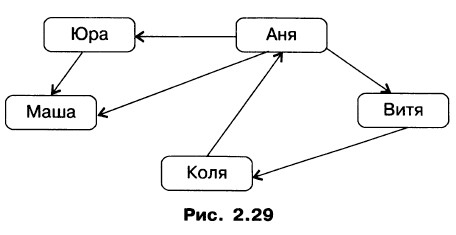 Отношение «переписываются» («пишут письма друг другу») является двухсторонним (симметричным). Поэтому соответствующие вершины соединены линиями без стрелок (ребрами). Граф называется неориентированным, если его вершины соединены ребрами. Путь по вершинам и ребрам графа, включающий любое ребро графа не более одного раза, называется цепью. Пример цепи: Юра — Аня — Витя — Коля. Цепь, начальная и конечная вершины которой совпадают, называется циклом. Пример цикла: Аня — Коля — Витя — Аня. Иначе выглядит граф, отражающий отношение «пишет письма» между теми же объектами класса «дети». Линии со стрелками (дуги) придают ему совершенно иной смысл (рис. 2.29).