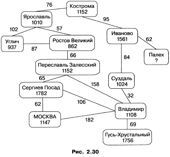 Граф называется взвешенным, если его вершины или ребра (дуги) характеризуются некоторой дополнительной информацией — весом вершины или ребра (дуги). На рис. 2.30 информация о городах Золотого кольца представлена взвешенным графом: веса его вершин — года основания городов, веса ребер — расстояния в километрах между городами.