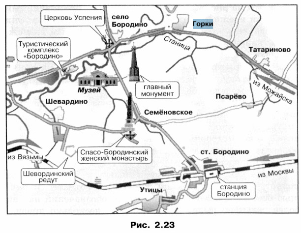 Схемы на рис. 2.21-2.24 являются информационными моделями внешнего вида соответствующих объектов. Они предназначены для того, чтобы у человека была возможность, например, выбрать подходящее место в зрительном зале, оценить размеры и расположение комнат будущей квартиры, разработать маршрут путешествия по Золотому кольцу, добраться до Бородинского поля и т. д. Для этих моделей большое значение имеет соблюдение масштаба. Для схемы проезда и карты также значение имеет соблюдение ориентации по сторонам света. Но, несмотря на точность рассмотренных информационных моделей, более подробные сведения об изображенных на них объектах (местах в зале, домах, дорогах, городах) из них получить нельзя. Схема как информационная модель не претендует на полноту предоставления информации об объекте. С помощью особых приемов и графических обозначений на ней более рельефно выделяется один или несколько признаков рассматриваемого объекта. Например, туристический маршрут «Золотое кольцо России» более образно запечатлен на схеме на рис. 2.25.