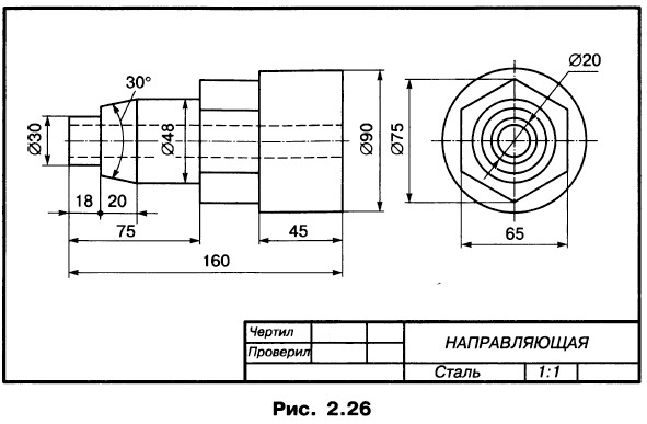 Здесь не полностью выдержан масштаб, но зато акцентировано внимание на городах, образующих Золотое кольцо, и их достопримечательностях. На уроках черчения вы учитесь строить чертежи — условные графические изображения предметов с точным соотношением их размеров, получаемые методом проецирования (рис. 2.26). Рисунок содержит изображения, размерные числа, текст. Изображения дают представления о геометрической форме детали, числа — о величине детали и ее частей, надписи — о названии, масштабе, в котором выполнены изображения, материале, из которого изготовлена деталь.