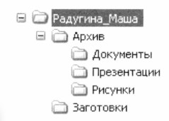Глава 4. Компьютерный практикум. Работа 2 Работаем с объектами файловой системыПоочередно переместите папки Документы, Презентации и Рисунки в папку Архив. Для этого: 1) выделите папку Документы и, удерживая нажатой левую кнопку мыши, перетащите папку Документы в папку Архив; 2) откройте контекстное меню папки Презентации, выполните команду Вырезать. Откройте папку Архив и с помощью контекстного меню вставьте в нее папку Презентации; 3) вырежьте папку Рисунки и вставьте ее в папку Архив с помощью команд строки меню. 9. С помощью контекстного меню переименуйте папку Заготовки_7 в Заготовки. 10. Убедитесь, что ваша папка имеет структуру, аналогичную приведенной ниже: