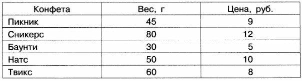 На закупку конфет вам выделено 500 рублей. Информация о весе и цене конфеты каждого вида приведена в таблице: