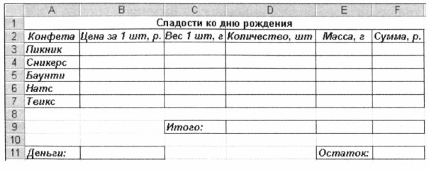 3. Так как в первом случае предполагается десять гостей, то число конфет каждого вида должно быть кратно 10. Присвойте ячейкам диапазона D3:D7 значение 10 и проследите за автоматическим пересчетом всех результатов. Придумайте, как можно потратить остаток денег.