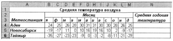 3. С помощью функции Среднее вычислите средние годовые значения температур на указанных метеорологических станциях.