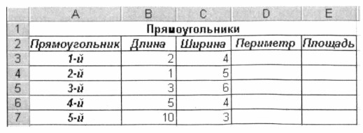 С помощью программы Microsoft Excel вычислите периметр и площадь прямоугольников, длины сторон которых равны 2 см и 4 см, 1 и 5 см, 3 и 6 см, 5 и 4 см, 10 и 3 см.