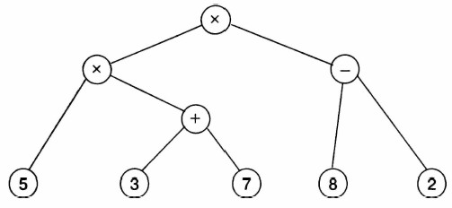 С помощью графа можно задать последовательность вычисления арифметического выражения. Такой граф представляет собой дерево, листьями которого являются числа, а прочими вершинами — операции. Дуги связывают вершину-операцию с вершинами-операндами. Например, для арифметического выражения 5 х (3 + 7) х (8 - 2) дерево будет иметь такой вид: