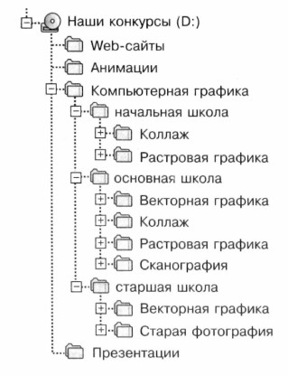 Работы участников школьных конкурсов по информационным технологиям записаны на диске, файловая структура которого имеет вид: