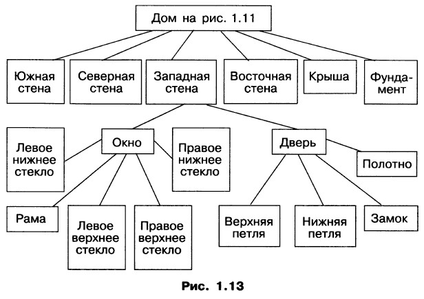 Глава 1. Объекты и системы § 1.5. Состав объектовНесколько другое описание получится, если попытаться отразить состав одного конкретного объекта. Например, на рис. 1.13 приведена схема состава конкретного дома — изображенного на рис. 1.11. На этой схеме все имена единичные — и имя всего дома, и имя каждого объекта-части.