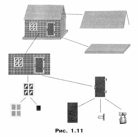 Глава 1. Объекты и системы Состав объектовВ зависимости от ситуации объект может либо рассматриваться как единое целое, либо «распадаться» на более мелкие объекты. Например, компьютер рассматривается как единое целое, если нужно подсчитать количество компьютеров в школе. Чтобы получить представление о возможностях компьютера, необходимо рассмотреть характеристики таких его устройств, как процессор, память, жесткий диск и т. д. Объект может состоять из множества одинаковых (однородных, подобных) объектов. Например, объект «апельсин» состоит из частей — долек апельсина. Объект «школьный класс» состоит из множества учеников — мальчиков и девочек приблизительно одного возраста. Каждый ученик является целой, самостоятельной частью объекта «школьный класс». Объект может состоять из множества различных объектов. Например, объект «компьютер» состоит из множества не похожих друг на друга объектов (системный блок, монитор, клавиатура и т. д.). При делении объекта «компьютер» на части новые объекты получают разные имена; признаки новых объектов различны. При описании состава объектов в одних случаях речь идет о составе конкретного объекта, а в других — об общих составных частях множества объектов. В последнем случае описание состава содержит ответ на вопрос «Из чего обычно состоят объекты некоторого множества?». Например: • «В состав дома входят стены, крыша, двери, окна, ...»; • «В составе автомобиля есть двигатель, кузов, багажник, ...». Описывая состав объекта, человек мысленно «разбирает» его на части. При этом, как правило, используют такой прием: сначала называют небольшое число крупных частей, затем каждую из них «разбирают» на части поменьше и т. д. Например, при описании состава дома удобно выделить сначала фундамент, стены и крышу, затем в составе стены выделить окно и дверь, затем сообщить, что окно состоит из рамы и стекол, и так же поступить, описывая состав двери (рис. 1.11).