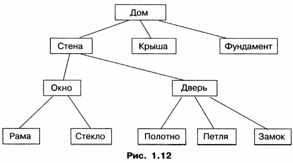 Схема отношений «входит в состав» (схема состава) отражает не только составные части, но и тот порядок, в котором предмет «разбирался» на части. Таким образом, она отражает строение (структуру) объекта. На схеме состава можно использовать линии без стрелок, если имя объекта-части всегда располагать ниже имени объекта, которому принадлежит эта часть. Все имена на рис. 1.12 — общие (обозначают множества предметов), потому что эта схема отражает состав не одного конкретного дома, а «дома вообще».