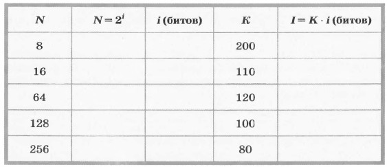 5. Как определить информационный объём сообщения, представленного символами некоторого естественного или формального языка? 6. Определите количество информации в сообщении из К символов алфавита мощностью N, заполняя таблицу: