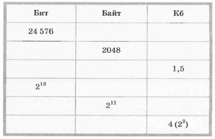 7. Племя Мульти пишет письма, пользуясь 16-символьным алфавитом. Племя Пульти пользуется 32-символьным алфавитом. Вожди племён обменялись письмами. Письмо племени Мульти содержит 120 символов, а письмо племени Пульти — 96. Сравните информационные объёмы сообщений, содержащихся в письмах. 8. Информационное сообщение объёмом 650 битов состоит из 130 символов. Каков информационный вес каждого символа этого сообщения? 9. Выразите количество информации в различных единицах, заполняя таблицу: