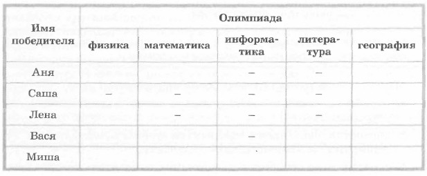 1) победитель олимпиады по информатике учит Аню и Сашу работе на компьютере; 2) Лена и Вася тоже заинтересовались информатикой; 3) Саша всегда побаивался физики; 4) Лена, Саша и победитель олимпиады по литературе занимаются плаванием; 5) Саша и Лена поздравили победителя олимпиады по математике; 6) Аня сожалеет о том, что у неё остаётся мало времени на литературу. Победителем какой олимпиады стал каждый из этих ребят? Решение. Задачи такого типа решаются с помощью логических рассуждений, которые удобно фиксировать в таблице. Ниже представлена таблица, в которой отражена информация о победителях олимпиад, содержащаяся в условии задачи. Например, из п. 1 можно сделать вывод, что ни Аня, ни Саша не являются победителями олимпиады по информатике. Это отражено в таблице знаками «—» в ячейках на пересечении строк и столбцов с соответствующими именами школьников и названиями олимпиад.