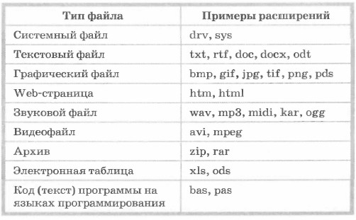 Файловая система — это часть ОС, определяющая способ организации, хранения и именования файлов на носителях информации. Файл характеризуется набором параметров (имя, размер, дата создания, дата последней модификации) и атрибутами, используемыми операционной системой для его обработки (архивный, системный, скрытый, только для чтения). Размер файла выражается в байтах. Файлы, содержащие данные — графические, текстовые (рисунки, тексты), называют документами, а файлы, содержащие прикладные программы, — файлами-приложениями. Файлы-документы создаются и обрабатываются с помощью файлов-приложений. Имя файла, как правило, состоит из двух частей, разделённых точкой: собственно имени файла и расширения. Собственно имя файлу даёт пользователь. Делать это рекомендуется осмысленно, отражая в имени содержание файла, хотя пользователь может задавать в качестве имени произвольный набор символов. Расширение имени обычно задаётся программой автоматически при создании файла. Расширения не обязательны, но они широко используются. Расширение позволяет пользователю, не открывая файла, определить его тип — какого вида информация (программа, текст, рисунок и т. д.) в нём содержится. Расширение позволяет операционной системе автоматически открывать файл. В современных операционных системах имя файла может включать до 255 символов, причём в нём можно использовать буквы национальных алфавитов и пробелы. Расширение имени файла записывается после точки и обычно содержит 3-4 символа. В ОС Windows в имени файла запрещено использование следующих символов: \, /, :, *, ?, ", <, >, |. В Linux эти символы, кроме /, допустимы, хотя использовать их следует с осторожностью, так как некоторые из них могут иметь специальный смысл, а также из соображений совместимости с другими ОС. Операционная система Linux, в отличие от Windows, различает строчные и прописные буквы в имени файла: например, FILE.txt, file.txt и FiLe.txt — это в Linux три разных файла. В таблице приведены наиболее распространённые типы файлов и их расширения: