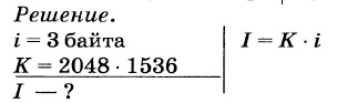 I = 2048 • 1536 • 3 = 2 • 210 • 1,5 • 210 • 3 = 9 • 220 (байтов) = 9 (Мб). Ответ: 9 Мб.