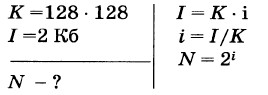 i = 2 • 1024 • 8/(128 • 128) = 2 • 210 • 23/(27 • 27) = 21+10+3 /27+7 = 214/214 = 1 (бит). N = 21 = 2. Ответ: 2 цвета — чёрный и белый.
