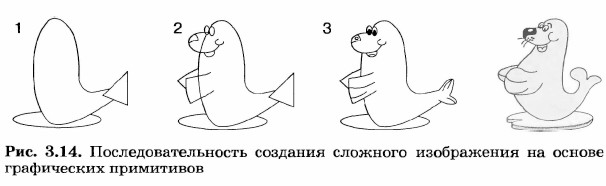 Основные инструменты рисования Карандаш и Кисть пользователь перемещает по экрану с помощью мыши. Получить таким способом нужную линию под силу только опытному пользователю, к тому же хорошо владеющему обычными карандашом и кистью. Начинающему художнику лучше всего использовать в своей работе инструменты Линия, Кривая, Прямоугольник, Эллипс и другие, позволяющие достаточно просто строить на экране компьютера простейшие геометрические фигуры, иначе называемые графическими примитивами. Из графических примитивов можно собирать достаточно сложные графические изображения (рис. 3.14).