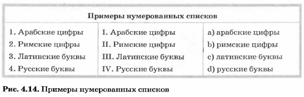 § 4.4. Визуализация информации в текстовых документах СпискиИзвестно, что текстовая информация воспринимается человеком лучше, если она визуализирована — организована в виде списков, таблиц, диаграмм, снабжена иллюстрациями (фотографиями, рисунками, схемами). Современные текстовые процессоры представляют пользователям широкие возможности визуализации информации в создаваемых документах. Всевозможные перечни в документах оформляются с помощью списков. При этом все пункты перечня рассматриваются как абзацы, оформленные по единому образцу. По способу оформления различают нумерованные и маркированные списки. Элементы (пункты) нумерованного списка обозначаются с помощью последовательных чисел, для записи которых могут использоваться арабские и римские цифры. Элементы списка могут быть пронумерованы и буквами — русскими или латинскими (рис. 4.14).