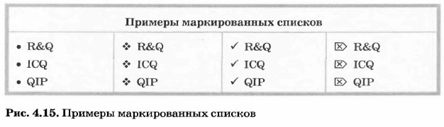 Нумерованный список принято использовать в тех случаях, когда имеет значение порядок следования пунктов. Особенно часто такие списки используют для описания последовательности действий. Нумерованные списки вы регулярно создаёте, заполняя в дневнике расписание уроков на каждый учебный день. При создании новых, удалении или перемещении существующих элементов нумерованного списка в текстовом процессоре вся нумерация списка меняется автоматически. Элементы маркированного списка обозначаются с помощью значков-маркеров. Пользователь может выбрать в качестве маркера любой символ компьютерного алфавита, и даже небольшое графическое изображение (рис. 4.15). С помощью маркированного списка оформлены ключевые слова в начале каждого параграфа вашего учебника.