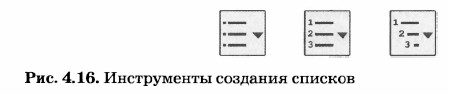 Маркированный список используют в тех случаях, когда порядок следования элементов в нём не важен. Например, в виде маркированного списка можно оформить перечень предметов, изучаемых вами в 8 классе. По структуре различают одноуровневые и многоуровневые списки. Списки в рассмотренных выше примерах имеют одноуровневую структуру. Список, элемент которого сам является списком, называется многоуровневым. Так, оглавление вашего учебника информатики является многоуровневым (трёхуровневым) списком. Списки создаются в текстовом процессоре с помощью команды строки меню или кнопок панели форматирования (рис. 4.16).