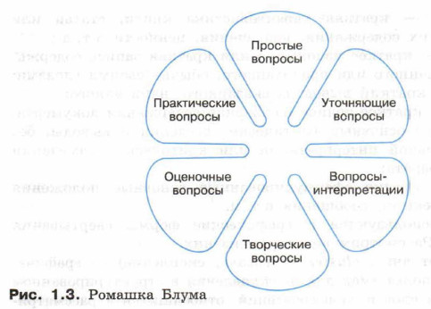 6. Практические вопросы, устанавливающие взаимосвязь между теорией и практикой, возможность практического использования информации. (Где может пригодиться ...? Как использовать ...?) Часто используется «ромашка Блума» — графическое изображение системы рассмотренных вопросов, названное так в честь американского педагога и психолога Бенджамина Блума (рис. 1.3).