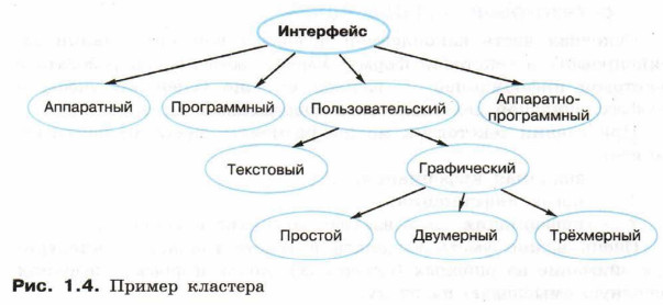 Широко используются и графические формы свёртывания информации. Рассмотрим некоторые из них. Кластер (от англ, cluster — гроздь, скопление) — графическая схема, используемая для представления в структурированном виде ключевых слов и словосочетаний, относящихся к рассматриваемому вопросу. При построении кластера в центральном овале располагают ключевое понятие. В овалах второго уровня — понятия, раскрывающие смысл ключевого. В овалах третьего уровня идёт детализация понятий, упомянутых на предыдущем уровне и т. д. На рисунке 1.4 представлен кластер, описывающий виды компьютерного интерфейса.