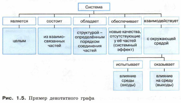 Ещё одна графическая форма свёртывания информации — денотатный граф (от лат. denote — обозначаю). При его построении необходимо придерживаться следующих правил. 1. Выделите ключевое понятие (слово или словосочетание) и проанализируйте его существенные признаки. Впишите ключевое понятие в верхний прямоугольник. 2. Как можно более точно подберите глаголы, связывающие ключевое понятие с его существенными признаками и отражающие движение от понятия к этим признакам. Это могут быть:
